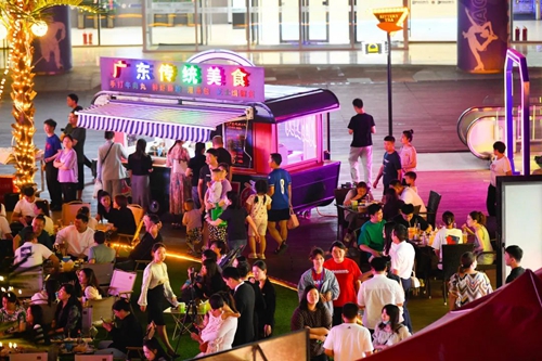 熠熠星光耀向夜空,呼應著霓虹閃爍的奧體中心,飄散的煙火氣和美食的香氣充斥著整個下沉空間,舞臺音樂節奏歡快、火爆酷炫,在霓虹交錯的空間里,一天的時間仿佛被夜市拉長,這是年輕人帶給這座城市的無限活力。