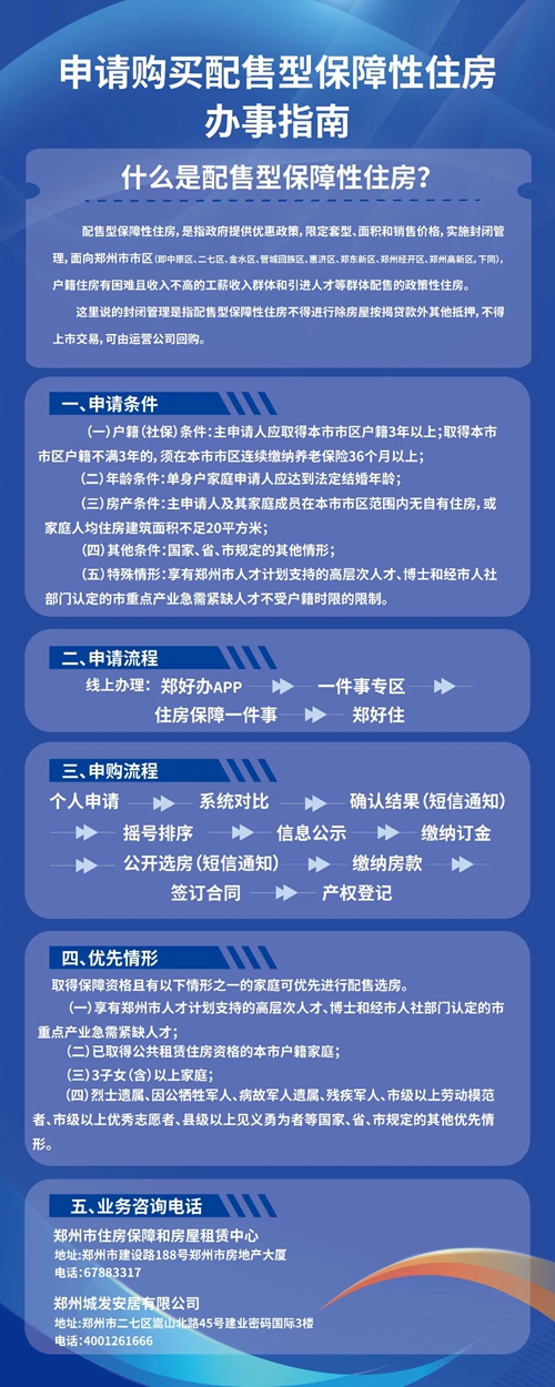 如在申請過程中有任何疑問,可以撥打鄭州市住房保障和房屋租賃中心咨詢電話:0371-67883316、0371-67883317;鄭州市城發安居有限公司咨詢電話:4001261666。咨詢時間為配售項目申請期間:8:30至20:00,其他時間(工作日):8:30至18:00。
