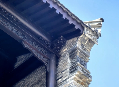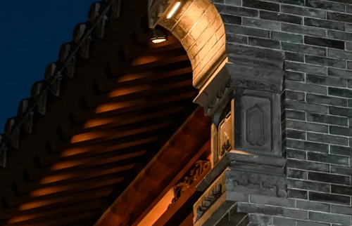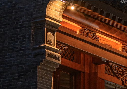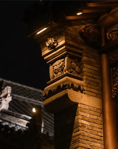 與之相對(duì)的17號(hào)樓主題為仙鶴,主題靈感來(lái)自于“仙鶴的故鄉(xiāng)”鶴壁。建筑上精美的墀頭也表達(dá)了此棟院子的主題,其上段位仙鶴,寓意松鶴延年,墀頭下端位仙鹿,寓意福祿綿長(zhǎng)。而這處雕刻精美又涵義豐富的墀頭設(shè)計(jì)來(lái)源于河南鶴壁的古城摘星臺(tái)公園。