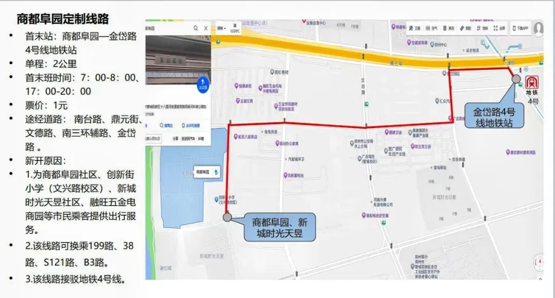 專線開通后,商都阜園項目租戶及業主實現了“出門即坐上公交,下車即地鐵口”的通勤效率新格局。線路途徑南臺路、鼎元街文德路、南三環輔路;中途包含超市、理發店、小商品城等便民商業點。無論是上班還是購物,都能享受到高效、舒適的出行體驗。線路單程2公里,除直達地鐵口外也可換乘199路、38路、S121路、B3路。不僅解決了租戶的通勤難題,也為周邊社區居民提供了便利,得到了大家的一致好評。