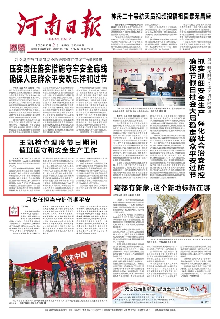 王凱來到省政府總值班室,視頻連線省氣象局、省交通運輸廳、省文化和旅游廳、省自然資源廳、省應急管理廳和洛陽市、開封市,詳細了解假期首日道路交通、文旅服務、安全生產等情況,向堅守在一線的工作人員致以節日問候。他說,今年“雙節”疊加,人流車流量大,各地各部門要深入學習貫徹習近平總書記在河南考察時重要講話精神,樹牢底線思維,強化風險意識,嚴格落實值班值守和信息報送等制度,加強會商研判和協調聯動,用辛勤付出為人民群眾創造平安祥和的節日環境。要密切關注天氣變化,提高氣象預報預警精準度,有效應對持續降雨天氣,切實加強山洪地質災害防范。要扎實做好交通運輸服務保障,加強高峰時段、熱點線路運力調配和管控疏導,確保群眾安全便捷出行。要更好激發文旅市場消費潛能,持續豐富業態,提升服務質量,讓廣大游客乘興而來、盡興而歸。要嚴格落實安全生產責任制,及時排查消除?;⒌V山、消防等重點領域風險隱患,加強商超、景區等人員密集場所安全監管,維護人民群眾生命財產安全。